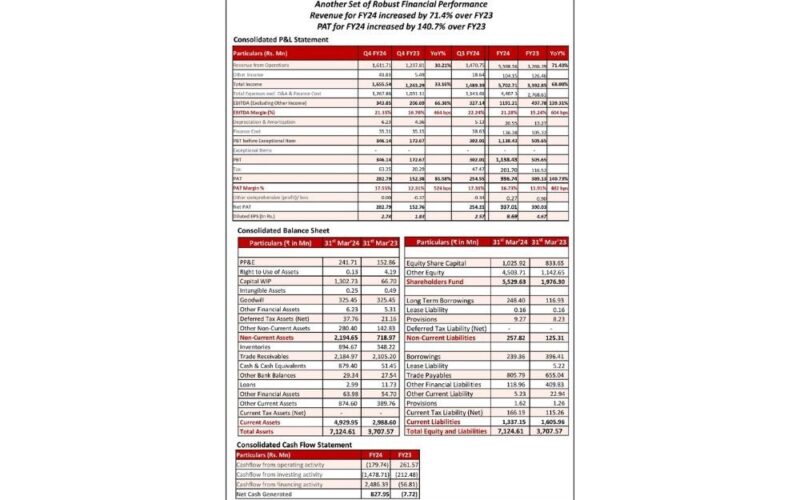 “We are happy to share our financial and business performance for FY24, we registered robust revenue growth of 71.40% and revenue from operations stood at ₹5,598.56 Mn in FY24 compared to ₹3,266.39 Mn in FY23 owing to our constant focus on client addition and continued demand for our specialized engineering products in the existing and new industries like railways, defense and heavy commercial vehicles. EBITDA grew by 139.31% and margins expanded by 604 bps from 15.24% in FY23 to 21.28% in FY24 owing to increase in scale of operations and increased demand for heavier products which tend to yield better margins. PAT margins improved by 482 bps from 11.91% in FY23 to 16.73% in FY24.