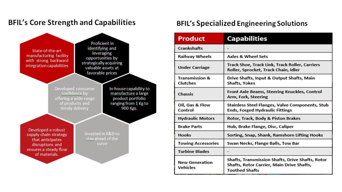 - BFIL encompasses precision machining capabilities with a comprehensive product range which caters to customers across various industries such as automobiles, ships, locomotives, aerospace, defence, oil and gas, railway, marine, prototypes and others.